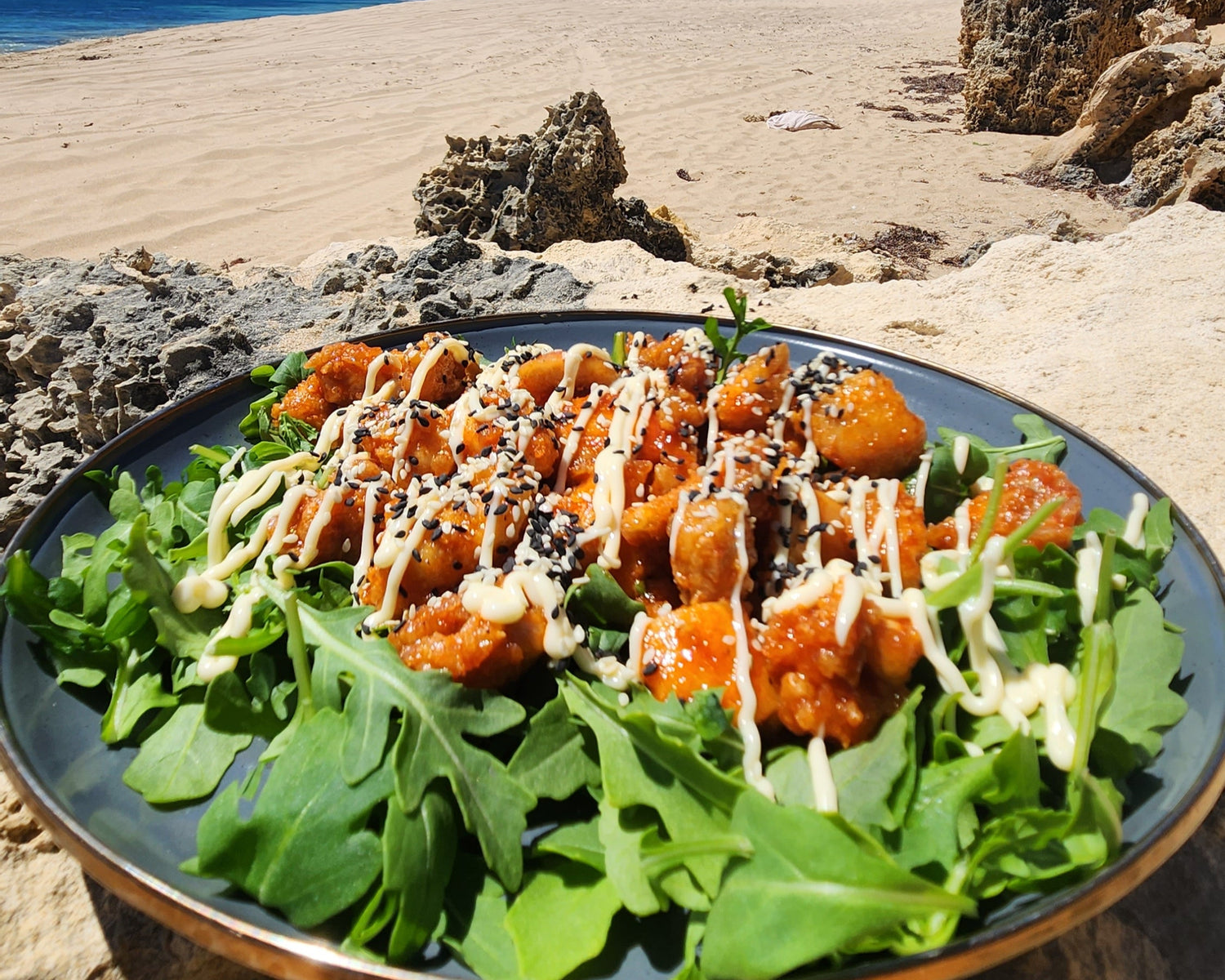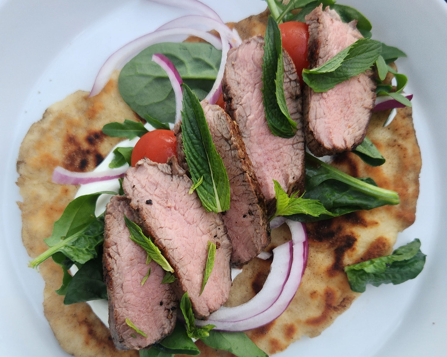 Hand made yoghurt flat bread, juicy lamb, mint and fresh salad